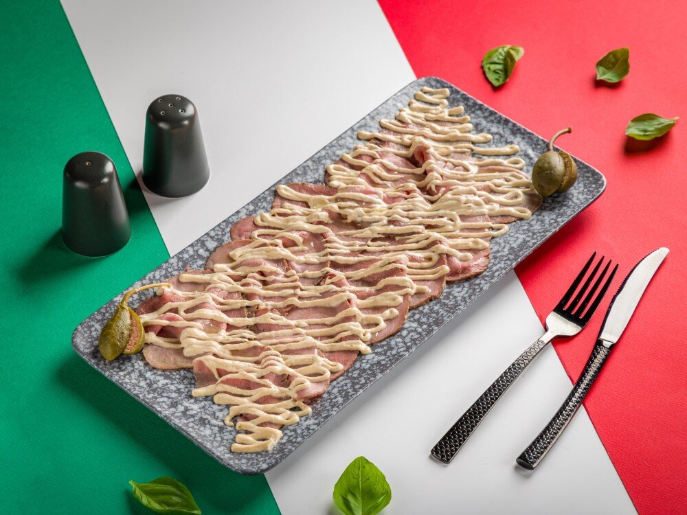 Ростбиф из мраморной говядины, соус из тунца (майонез домашний, тунец консервированный, каперсы, масло оливковое), руккола