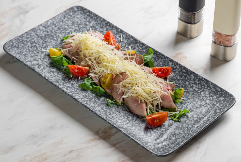 Ростбиф из мраморной говядины, руккола, сыр Пармезан, томаты черри, оливковое масло