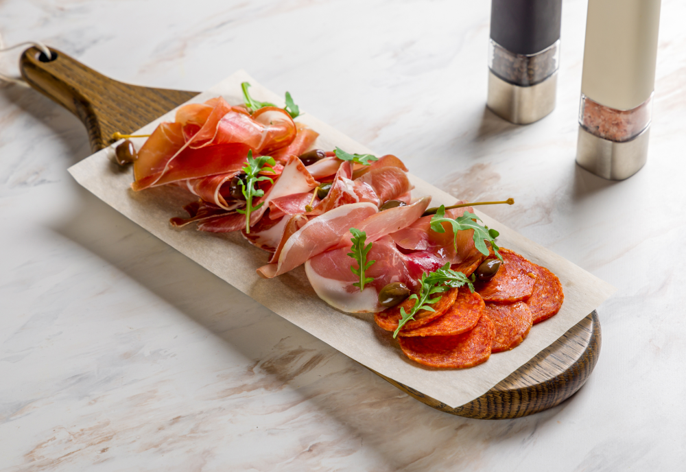 Ветчина Миланская, Коппа, окорок Парма, колбаса Пепперони, маслины "таджаски", масло оливковое, каперсы из Пантеллерии