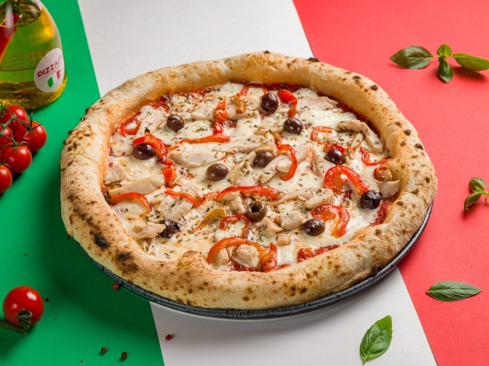 куриное филе грудки су-вид, соус томатный, моцарелла, перец сладкий, маслины "таджаски", орегано, масло оливковое