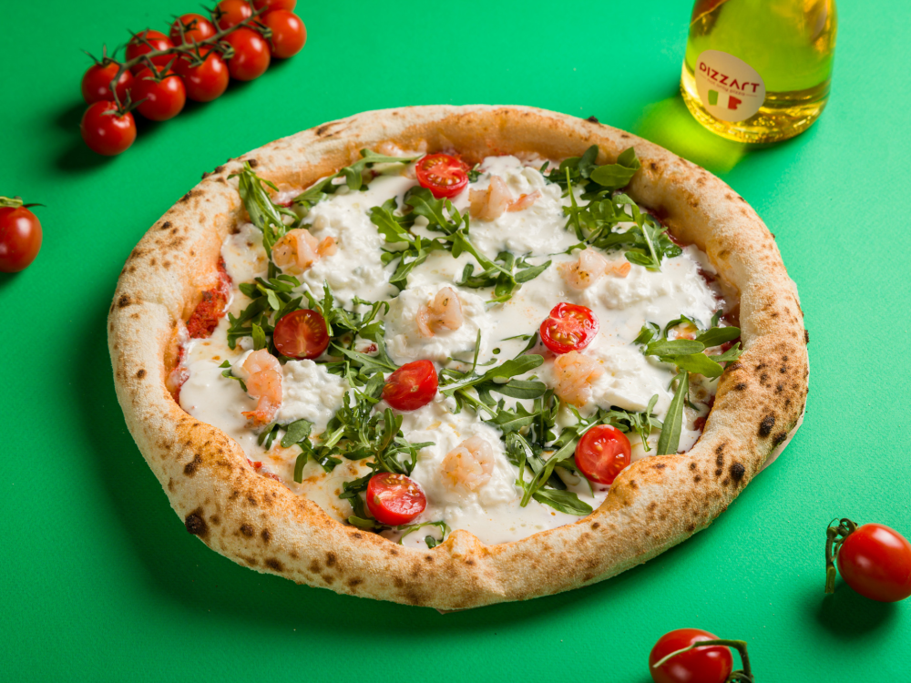 Пицца Страчателла, руккола, креветки