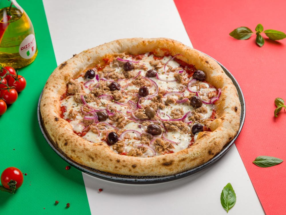 соус томатный, сыр Моцарелла, тунец консервированный, лук красный, маслины "таджаски", орегано, масло оливковое
