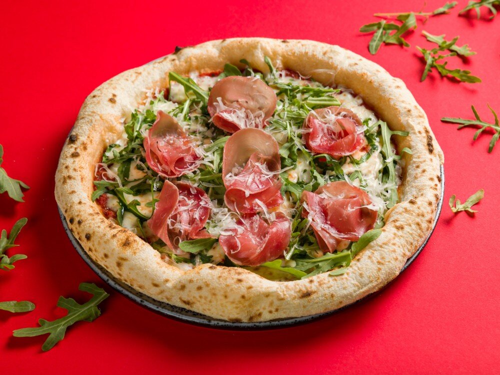 соус томатный, сыр Моцарелла, руккола, ветчина Парма, сыр Пармезан, масло оливковое