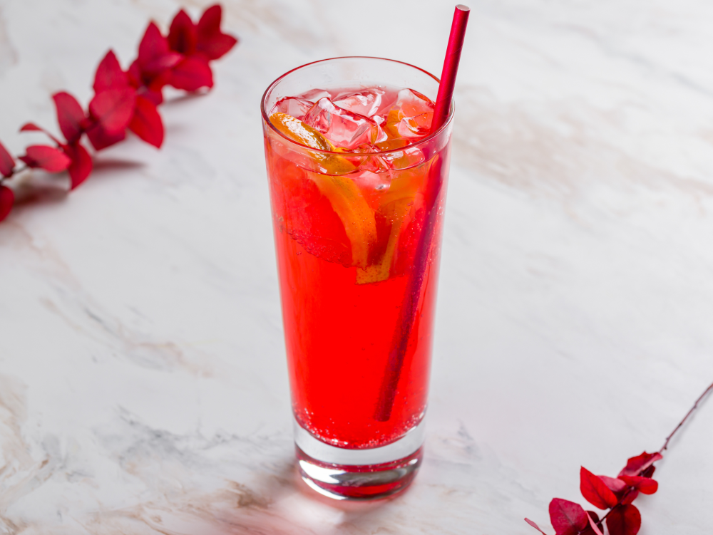 Сироп клубники, сироп грейпфрута, свежевыжатый сок лимона, вода газированная, лед
