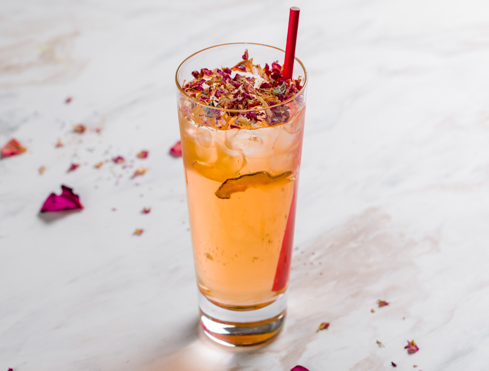 Сироп роза, сироп персик, свежевыжатый сок лимона, вода газированная, лед